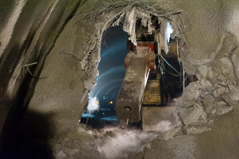 Rýpadlo preráža stenu tunela počas slávnostného prerazenia tunela Považský Chlmec, ktorý je súčasťou diaľnice D3 Žilina, Strážov – Žilina, Brodno. Žilina, 28. január 2016. Foto: SITA/Milo Fabian