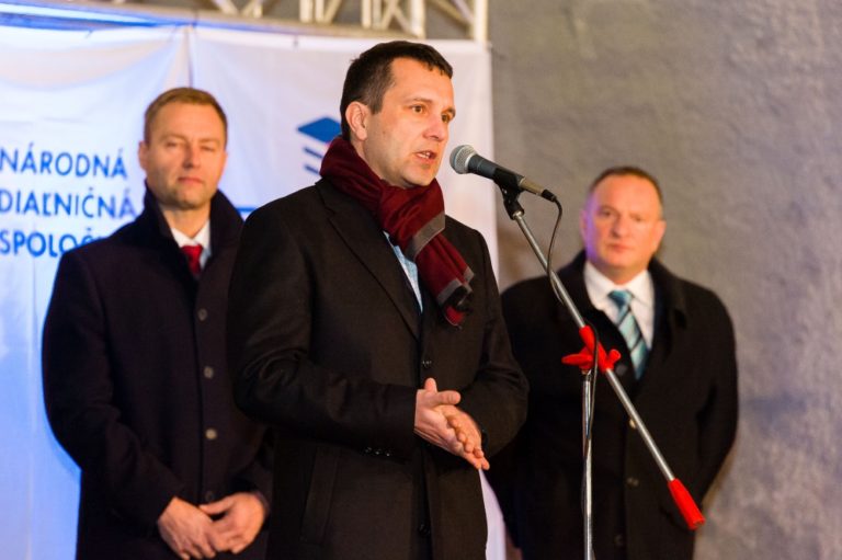 Generálny riaditeľ NDS Milan Gajdoš (v strede) počas príhovoru pri príležitosti slávnostného prerazenia tunela Považský Chlmec, ktorý je súčasťou diaľnice D3 Žilina, Strážov – Žilina, Brodno. Žilina, 28. január 2016. Foto: SITA/Milo Fabian