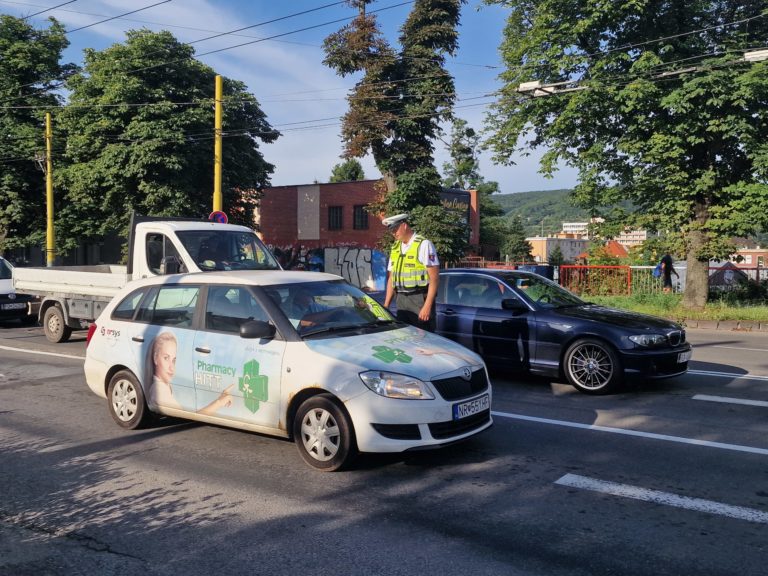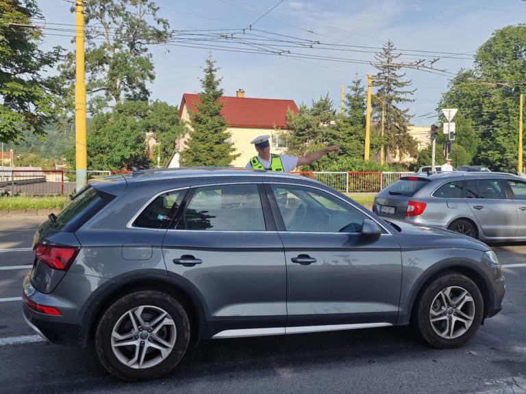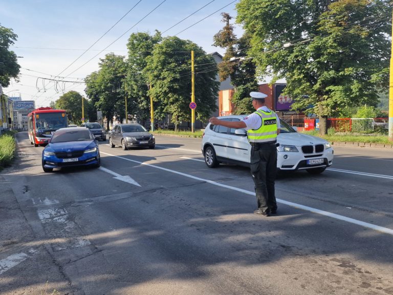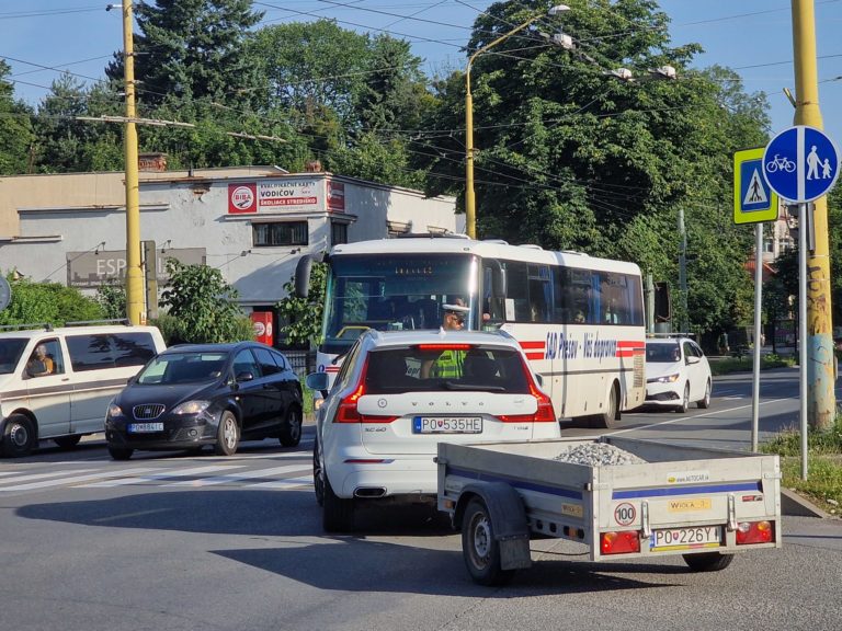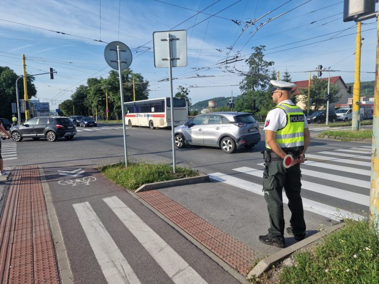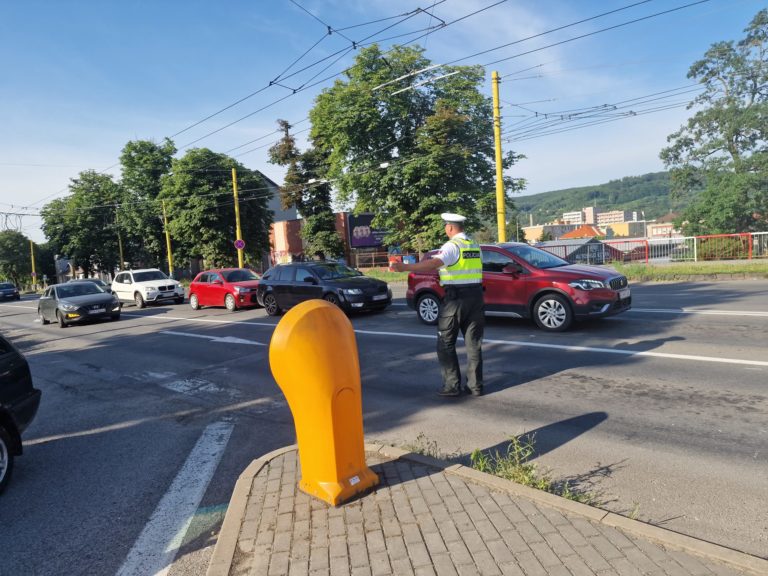 Polícia počas monitoringu a koordinácie dopravy na frekventovaných križovatkách mesta Prešov, ktoré v týchto mesiacoch zažívajú nápor v súvislosti s rekonštrukciou mosta na ulici Lesík delostrelcov. Prešov, 26. jún 2024. Foto: SITA/Ivan Kriššák