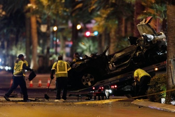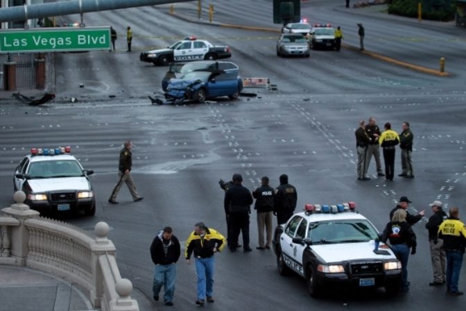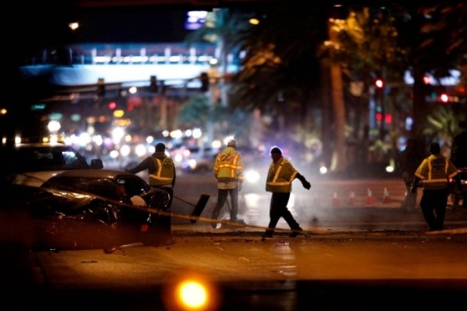 Policajti sú v blízkosti miesta činu po prestrelke, ktorá sa odohrala v Las Vegas v nedeľu 08.06.2014. Muž a žena vošli do reštaurácie, kde zastrelili dvoch policajtov. Pár pokračoval vo vyčíňaní aj na ulici a zastrelil ešte jedného človeka a následne spáchali samovraždu. Foto: SITA/ AP