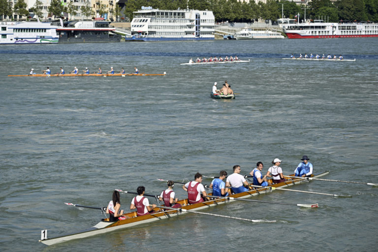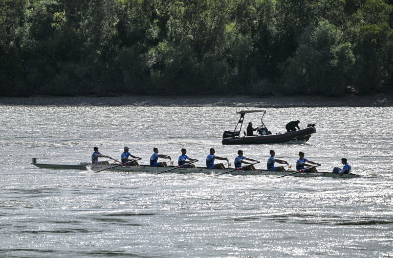 Účastníci na rieke Dunaj počas 29. ročníka pretekov osemveslíc z Devína do Bratislavy. Bratislava, 16. september 2023. Foto: SITA/Milan Illík.