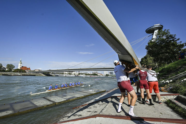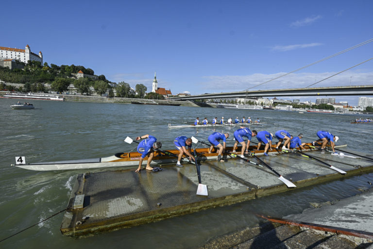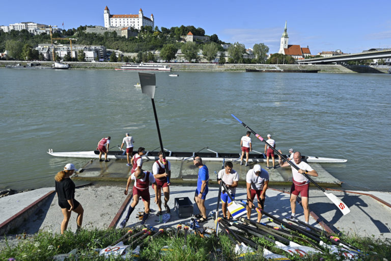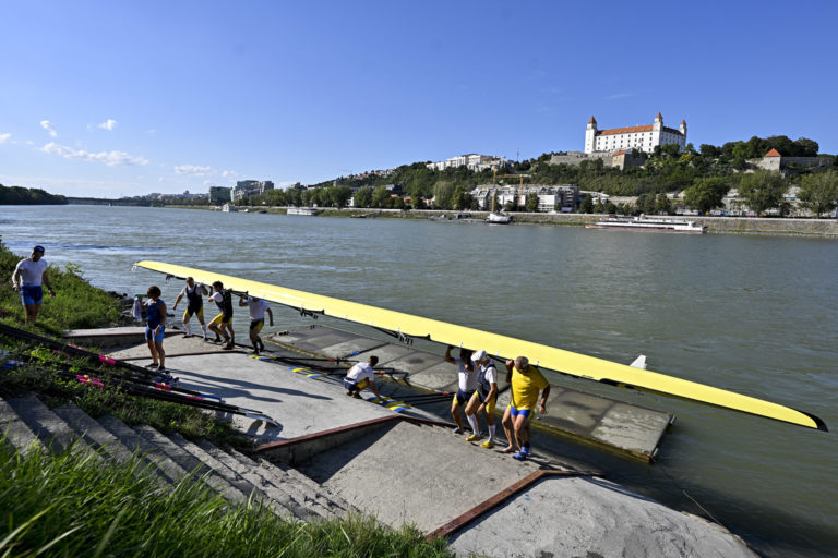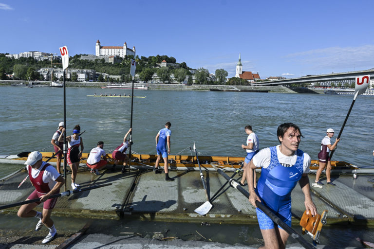 Účastníci pri rieke Dunaj počas 29. ročníka pretekov osemveslíc z Devína do Bratislavy. Bratislava, 16. september 2023. Foto: SITA/Milan Illík.