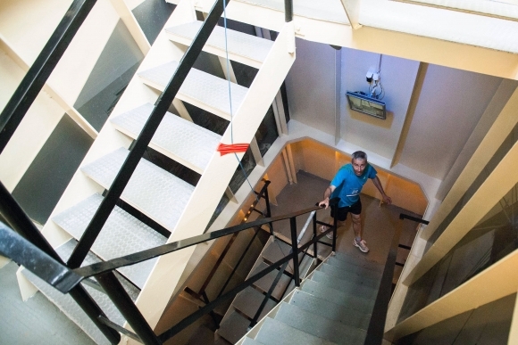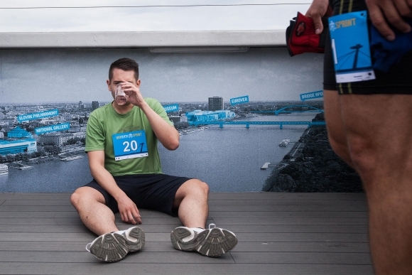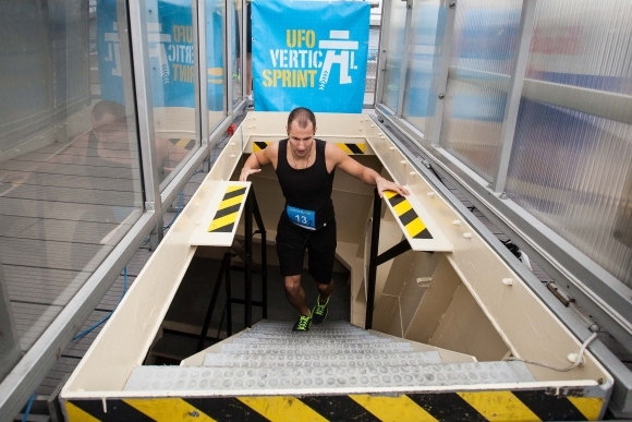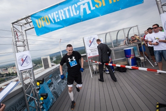 Pretekár počas pretekov po schodoch UFO Vertical Sprint na vežu UFO na Moste SNP. Bratislava, 16. jún 2013. Foto: SITA/Jozef Jakubčo