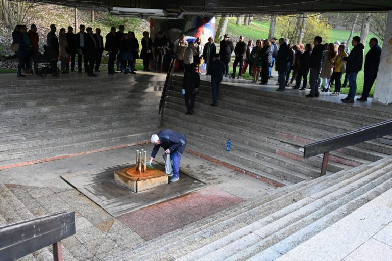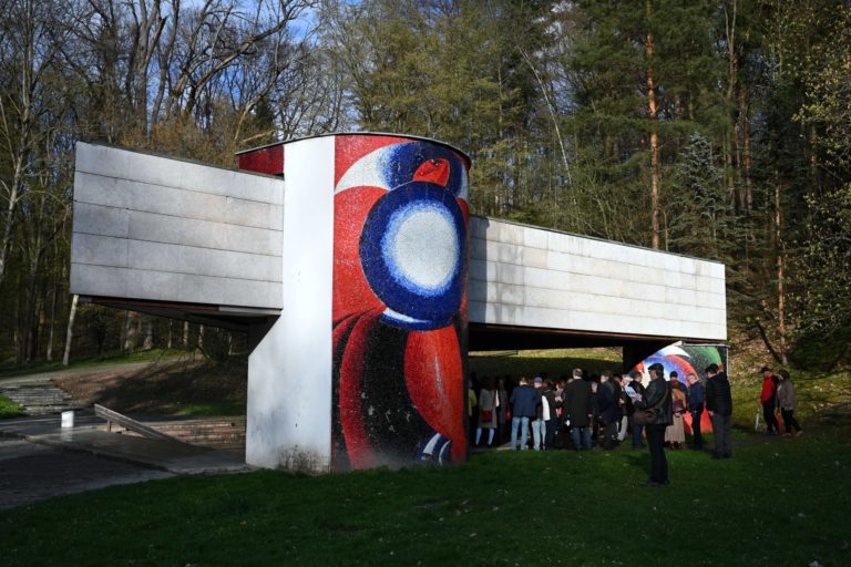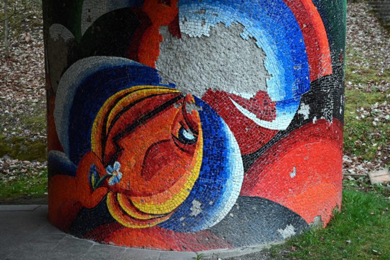 Detail mozaiky akademického sochára Milana Laluhu v pavilóne minerálnych prameňov. Kúpele Sliač čaká obnova zanedbaných historických kúpeľných domov a obnova celého kúpeľného areálu. Sliač, 17. apríl 2023. Foto: SITA/Jakub Julény