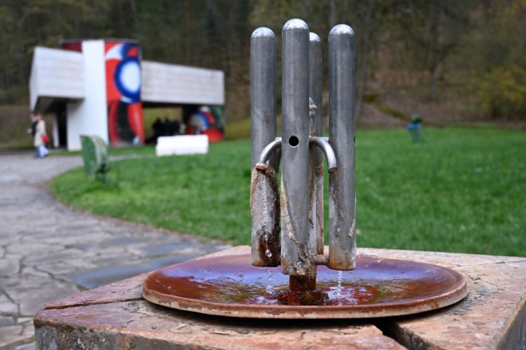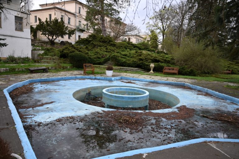 Fontána v areáli sliačskych kúpeľov. Kúpele Sliač čaká obnova zanedbaných historických kúpeľných domov a obnova celého kúpeľného areálu.. Sliač, 17. apríl 2023. Foto: SITA/Jakub Julény