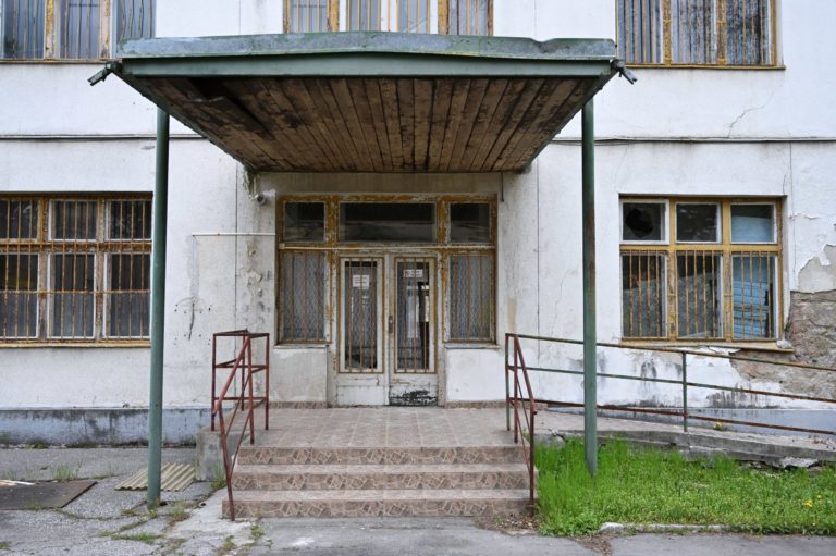 Schátraný hlavný vchod do sliačskeho Kúpeľného domu Slovensko. Kúpele Sliač čaká obnova zanedbaných historických kúpeľných domov a obnova celého kúpeľného areálu. Sliač, 17. apríl 2023. Foto: SITA/Jakub Julény