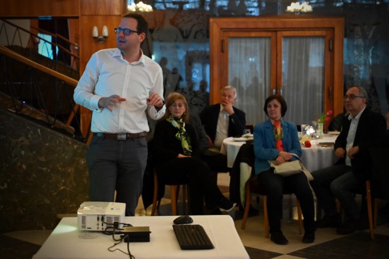Riaditeľ spoločnosti Kúpele Sliač Martin Beňuch (vľavo) počas prezentácie víťazného návrhu plánovanej rekonštrukcie kúpeľného areálu na Sliači. Sliač, 17. apríl 2023. Foto: SITA/Jakub Julény