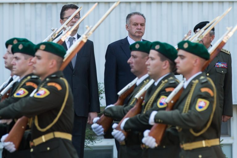 Prezident SR Andrej Kiska (uprostred) počas privítania pri príležitosti návštevy prezidenta SR na Ministerstve obrany SR. Bratislava, 7. júl 2014. Foto: SITA/Jozef Jakubčo