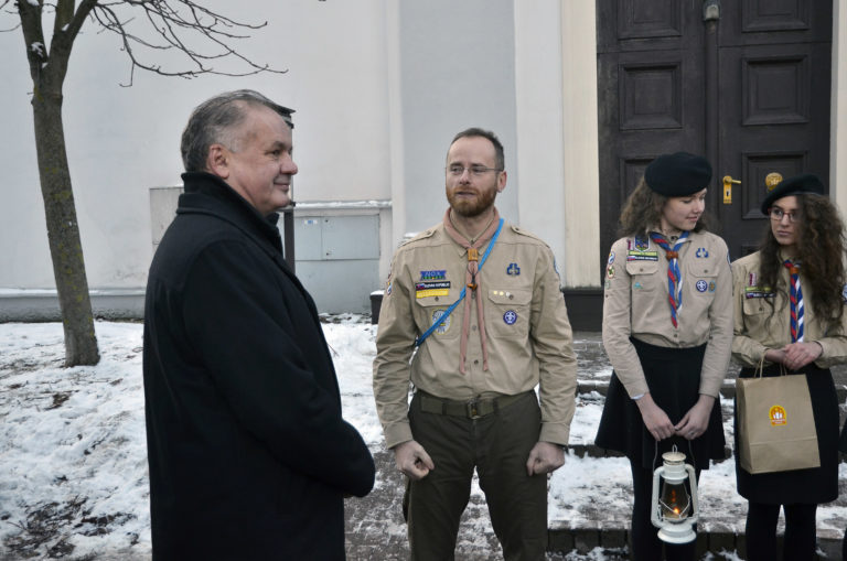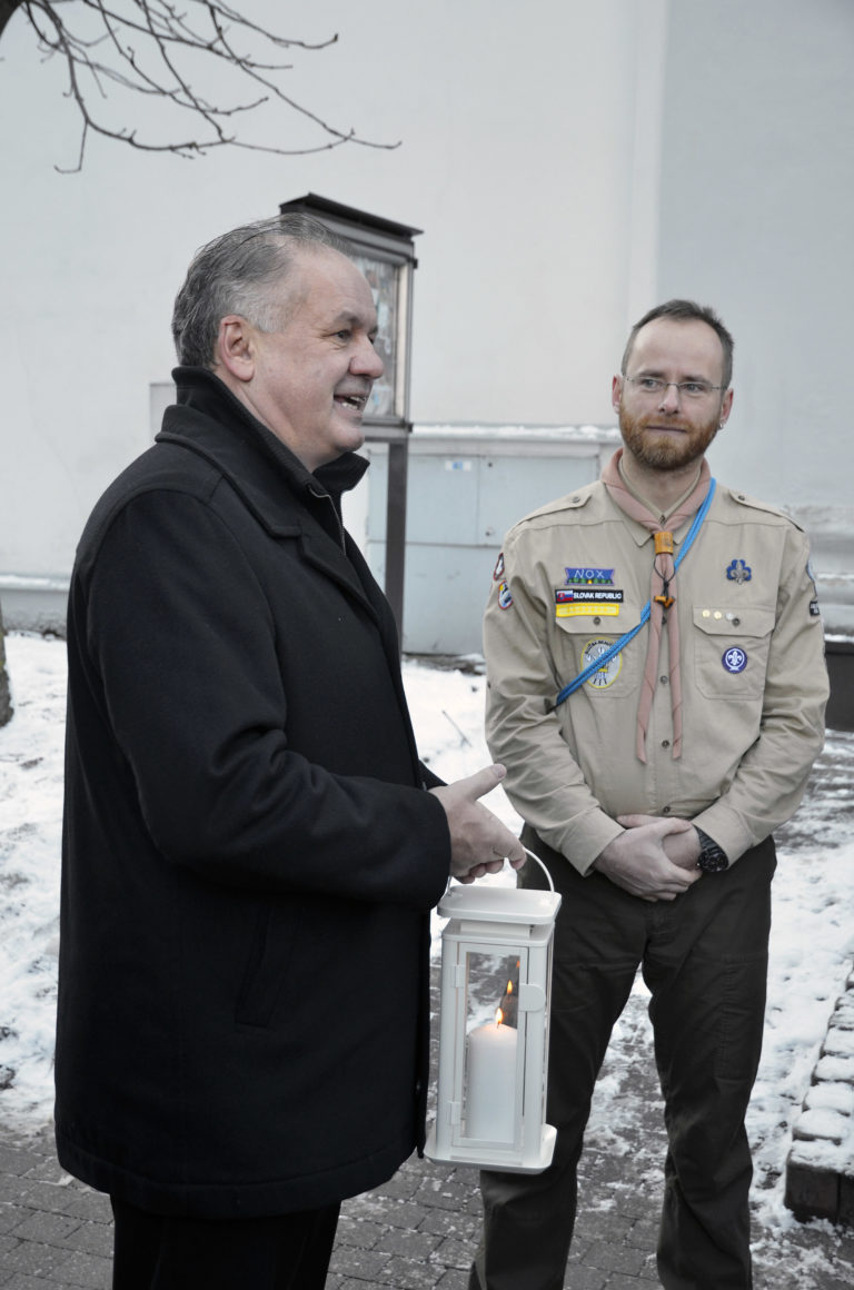 Prezident SR Andrej Kiska (vľavo) s Betlehemským svetlom od slovenských skautov na Námestí sv. Egídia v Poprade. Poprad, 17. december 2017. Foto: SITA/Radoslav Maťaš.