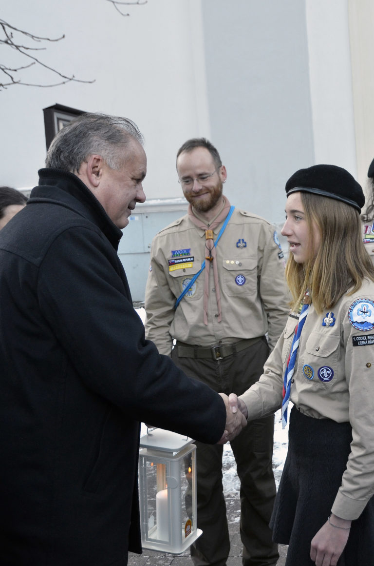 Prezident SR Andrej Kiska (vľavo) prichádza prevziať Betlehemské svetlo od slovenských skautov na Námestí sv. Egídia v Poprade. Poprad, 17. december 2017. Foto: SITA/Radoslav Maťaš.