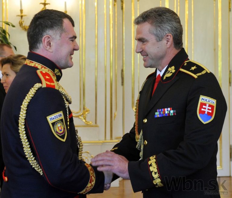 Prezident Hasičského a záchranného zboru SR Alexander Nejedlý (vľavo) a prezident policajného zboru Tibor Gašpar počas slávnostného vymenovania Nejedlého do hodnosti generála. Foto: SITA/Ján Slovák