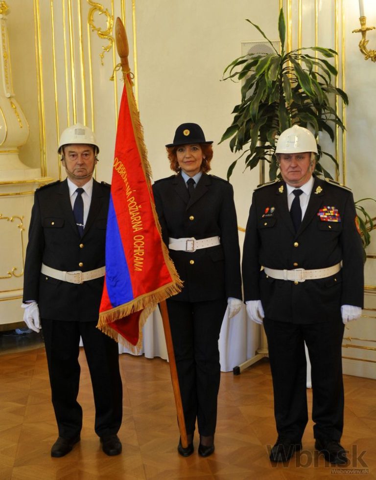 Členovia Dobrovoľnej požiarnej ochrany počas prijatia predstaviteľov Dobrovoľnej požiarnej ochrany SR prezidentom SR. Foto: SITA/Ján Slovák