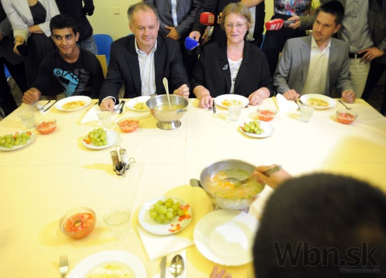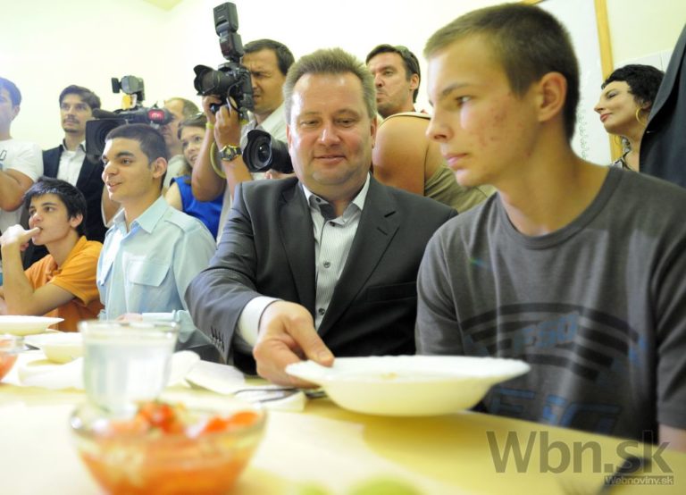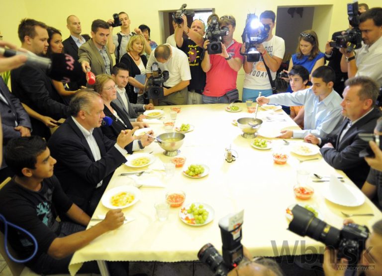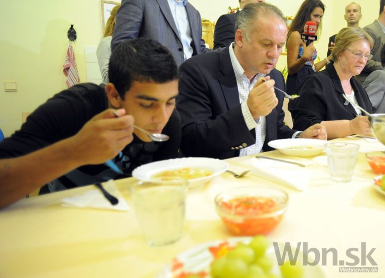 Prezident SR Andrej Kiska (druhý zľava) a riaditeľ centra Viktor Vicena (vpravo) počas spoločného obeda spolu s chovancami pri príležitosti návštevy prezidenta SR v Reedukačnam centre v Hlohovci. Hlohovec, 5. august 2014. Foto: SITA/Martin Havran