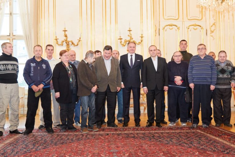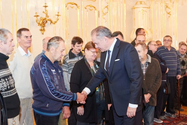 Prezident SR Andrej Kiska (vpravo v popredí) a členovia resocializačnej komunity Resoty, ktorú založil Anton Srholec počas prijatia pred slávnostným obedom v Prezidentskom paláci. Bratislava, 8. november 2016. Foto: SITA/Marek Mrviš