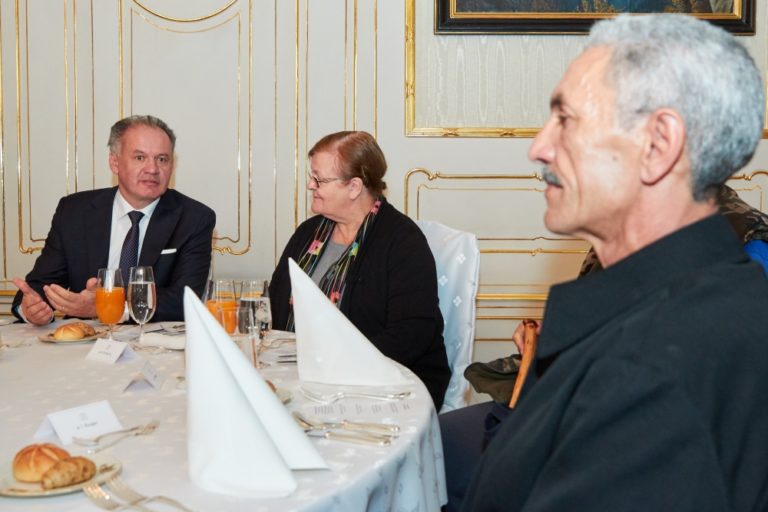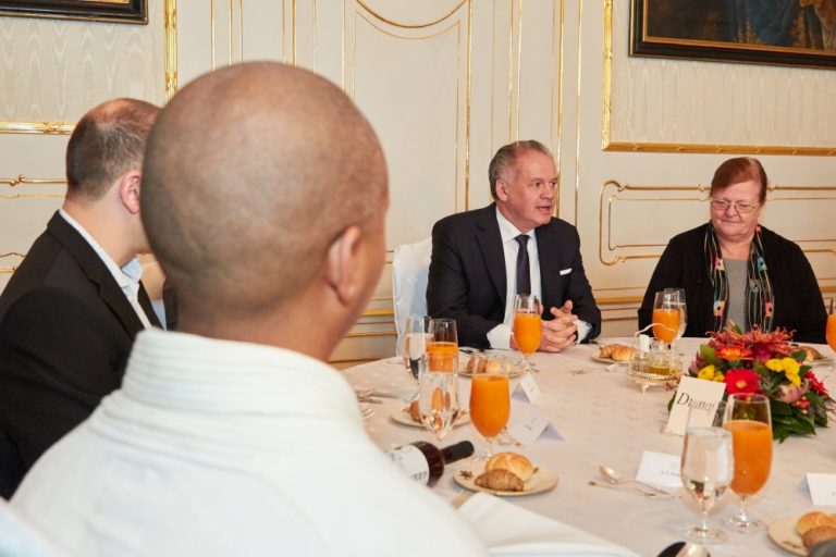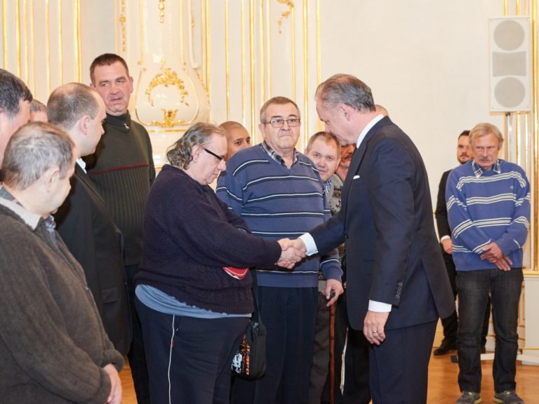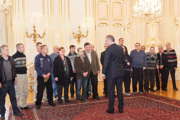 Prezident SR Andrej Kiska (druhý sprava) a členovia resocializačnej komunity Resoty, ktorú založil Anton Srholec pred slávnostným obedom v Prezidentskom paláci. Foto: SITA/Marek Mrviš