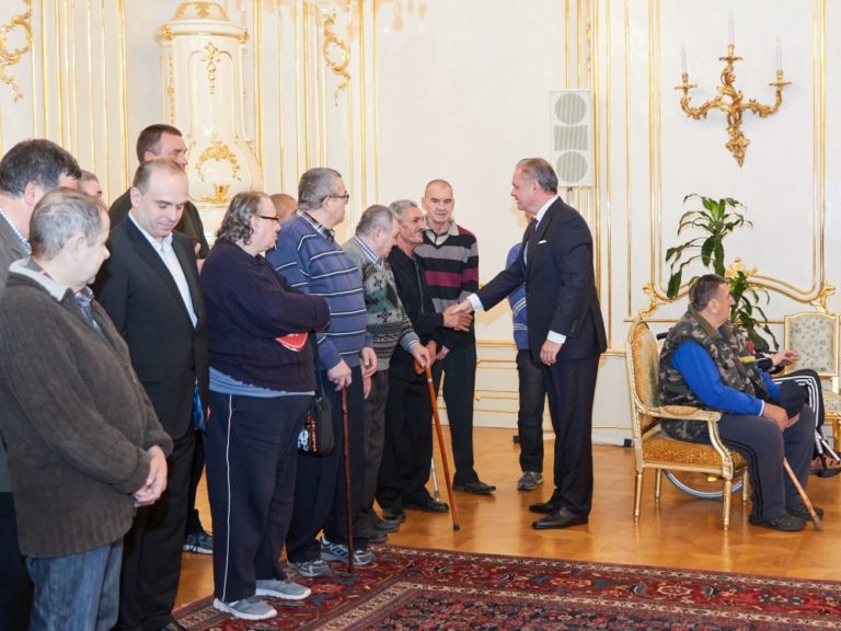 Prezident SR Andrej Kiska (druhý sprava) a členovia resocializačnej komunity Resoty, ktorú založil Anton Srholec počas prijatia pred slávnostným obedom v Prezidentskom paláci. Bratislava, 8. november 2016. Foto: SITA/Marek Mrviš