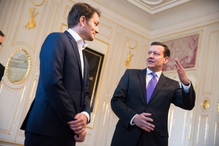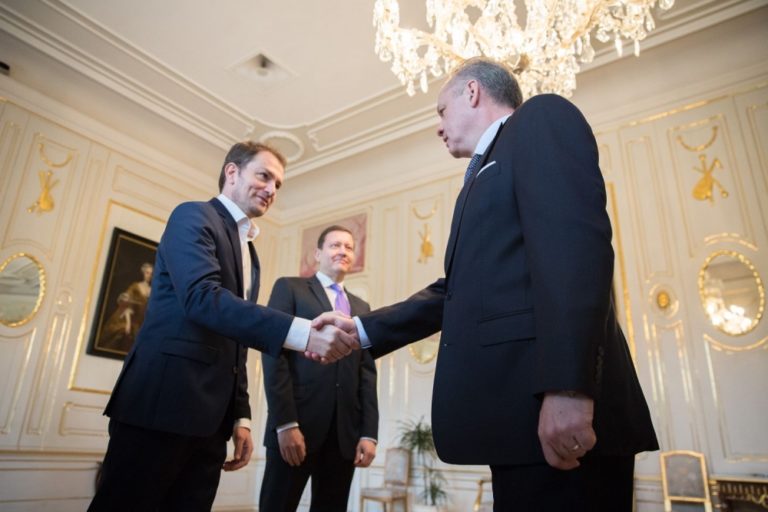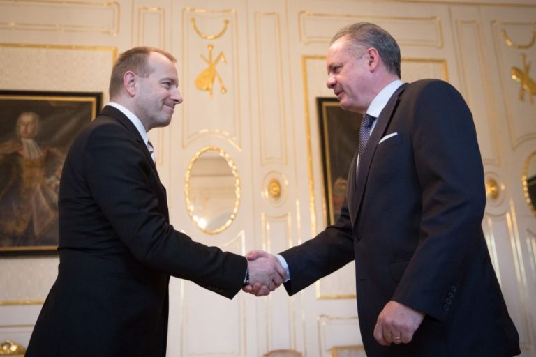 Zľava: Predseda strany #Sieť Radoslav Procházka a prezident SR Andrej Kiska počas prijatia u prezidenta SR v Prezidentskom paláci. Bratislava, 7. marec 2016. Foto: SITA/Marko Erd