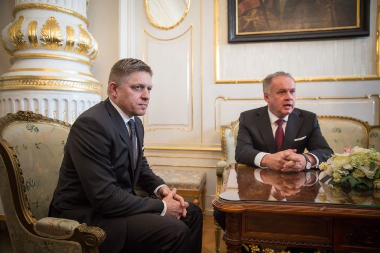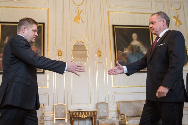 Zľava: Predseda strany Smer-SD a predseda vlády SR Robert Fico a prezident SR Andrej Kiska počas prijatia v Prezidentskom paláci. Bratislava, 9. marec 2016. Foto: SITA/Marko Erd