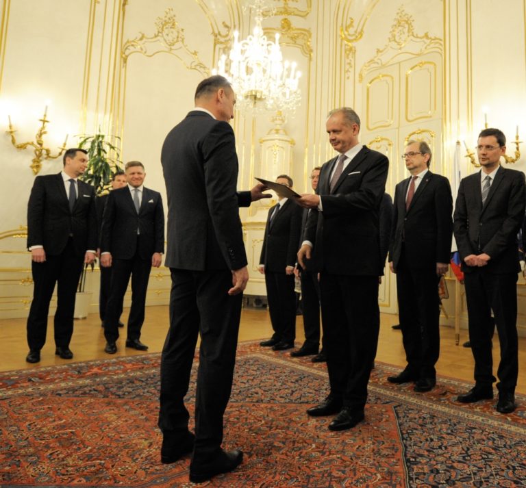 Robert Fico (v strede) počas vymenovania predsedu novej vlády SR prezidentom SR v Prezidentskom paláci. Bratislava, 23. marec 2016. Foto: SITA/Martin Medňanský