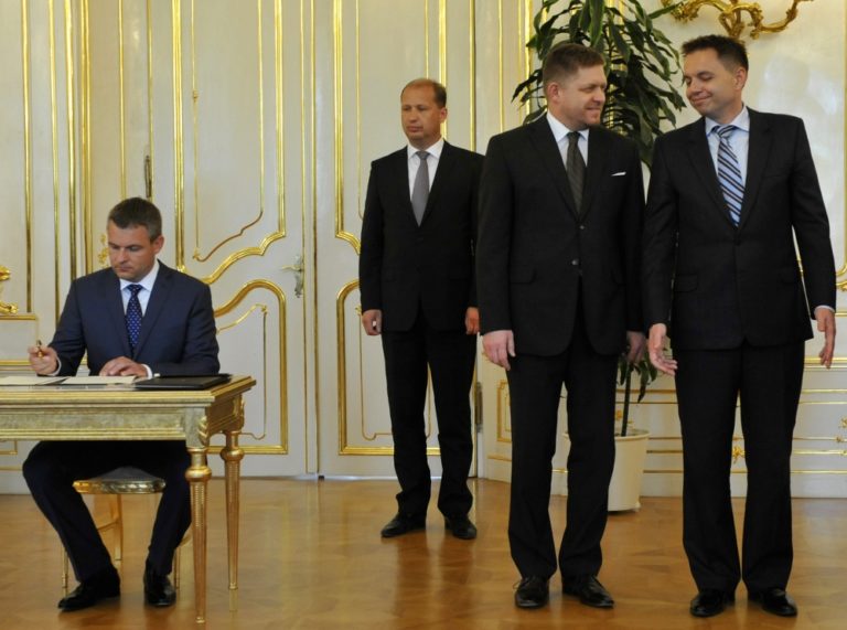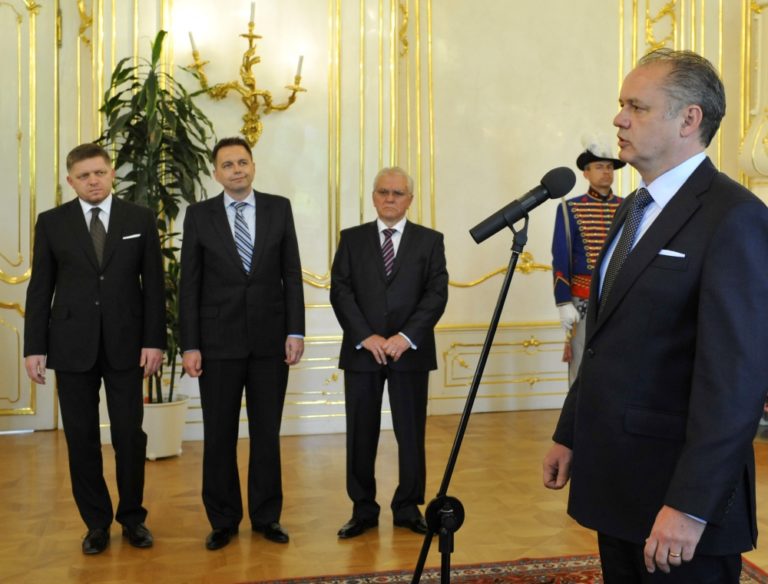 Prezident SR Andrej Kiska (vpravo) počas prijatia demisie členov vlády SR a vymenovania nových členov vlády SR. Zľava premiér SR Robert Fico, minister financií Peter Kažimír a premiérov poradca Vladimír Faič. Bratislava, 3. júl 2014 Foto: SITA/Jozef Jakubčo