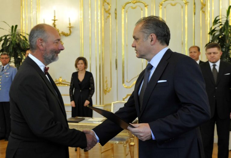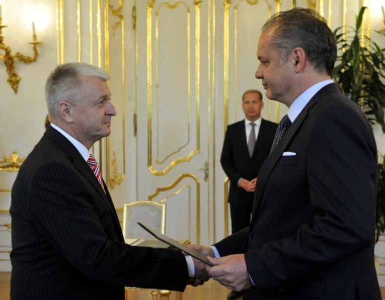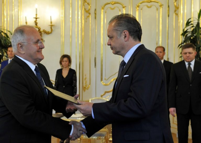 Prezident SR Andrej Kiska (vpravo) počas prijatia demisie členov vlády SR a vymenovania nových členov vlády SR. Vľavo novovymenovaný minister hospodárstva Pavol Pavlis. Bratislava, 3. júl 2014 Foto: SITA/Jozef Jakubčo