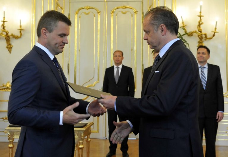Prezident SR Andrej Kiska (vpravo) počas prijatia demisie členov vlády SR a vymenovania nových členov vlády SR. Vľavo novovymenovaný minister školstva Peter Pellegrini. Bratislava, 3. júl 2014 Foto: SITA/Jozef Jakubčo