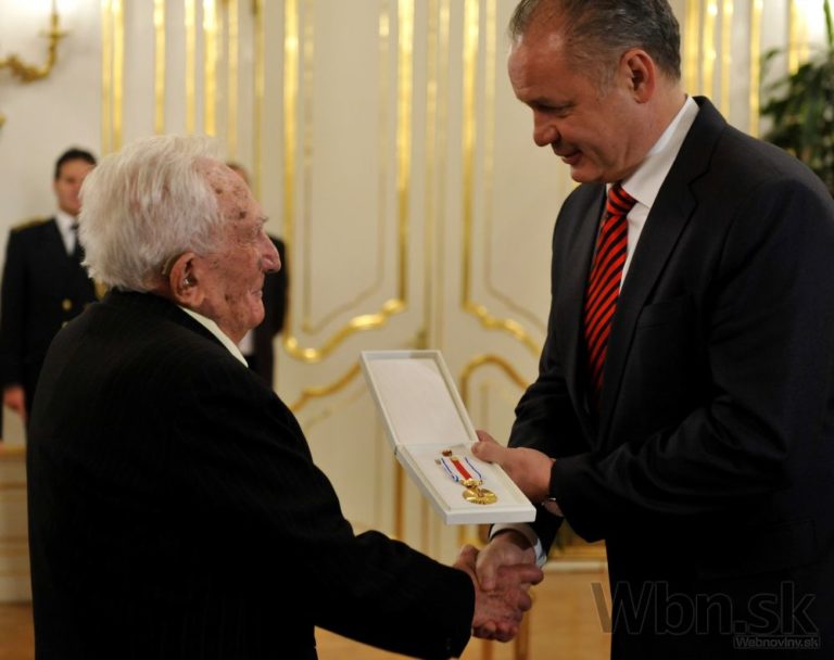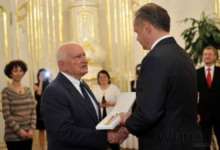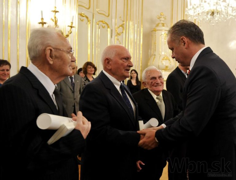 Zľava: Jaroslav Fabok a prezident SR Andrej Kiska počas odovzdávania štátneho vyznamenania - Medaily prezidenta SR bojovníkom za slobodu a demokraciu. Bratislava, 17. november 2014. Foto: SITA/Ján Slovák