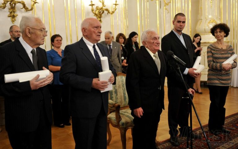 Vyznamenaní zľava: Jaroslav Fabok, Ján Zeman, Alexander Bachnár, syn Marcela Strýka, vyznamenaného in memoriam, Martin Strýko, a dcéra Agneše Kalinovej, vyznamenanej in memoriam, Júlia Sherwood, po prevzatí štátnych vyznamenaní - Medailí prezidenta SR bojovníkom za slobodu a demokraciu. Bratislava, 17. november 2014. Foto: SITA/Ján Slovák