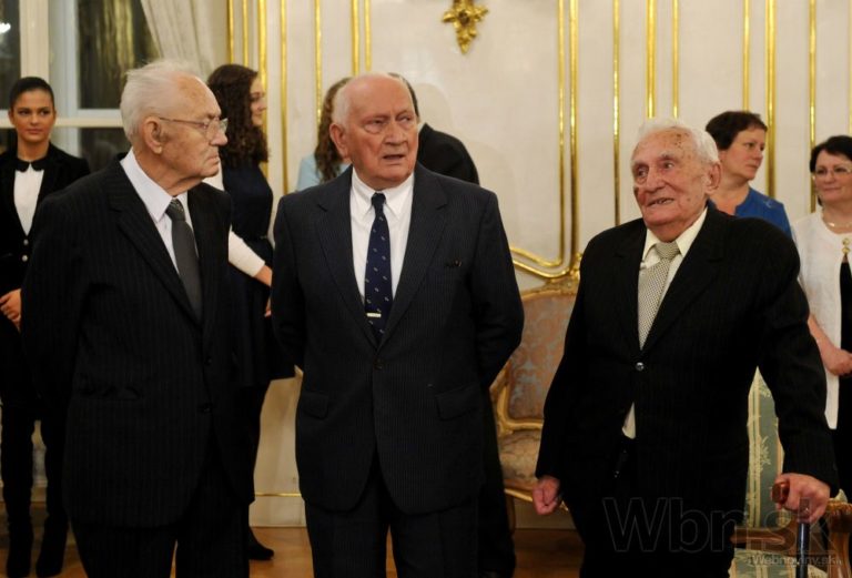 Zľava: Jaroslav Fabok, Ján Zeman a Alexander Bachnár pred prevzatím štátnych vyznamenaní - Medailí prezidenta SR bojovníkom za slobodu a demokraciu. Bratislava, 17. november 2014. Foto: SITA/Ján Slovák