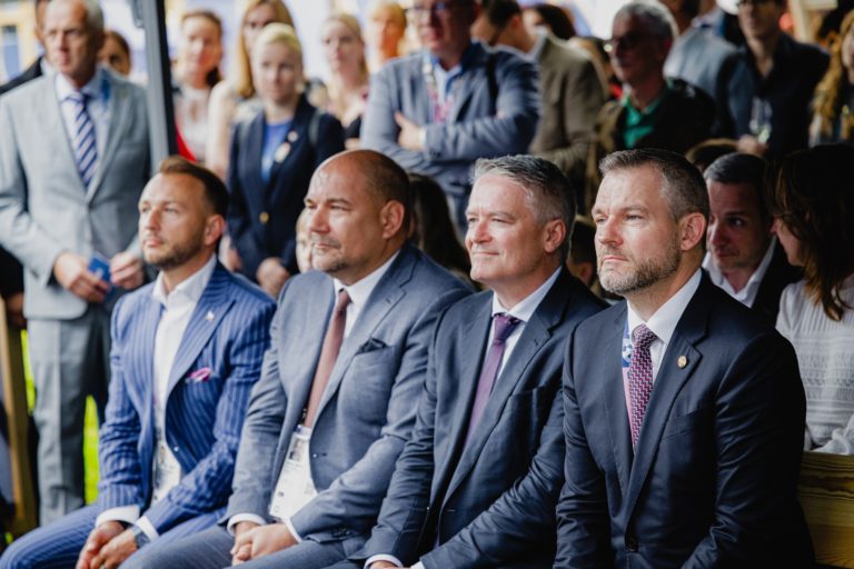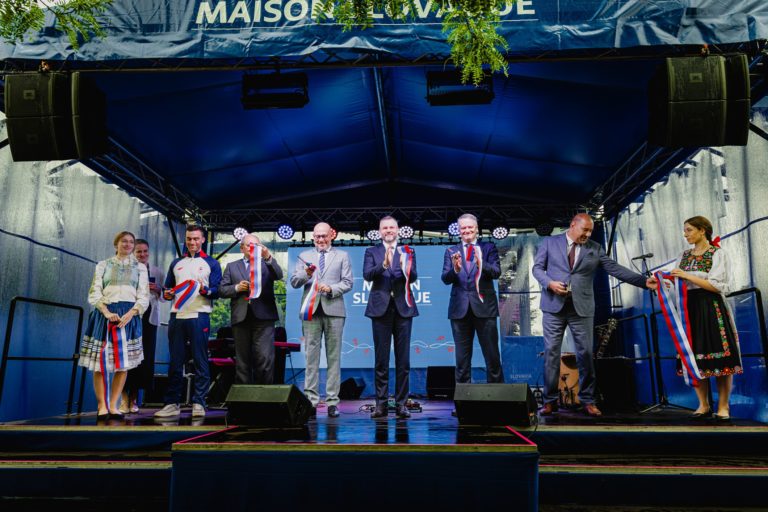 Sprava: Prezident SR Peter Pellegrini, generálny tajomník OECD Mathias Cormann, minister cestovného ruchu a športu Dušan Keketi a minister vnútra SR Matúš Šutaj Eštok počas otvorenia Slovenského olympijského domu Maison Slovaque v Paríži. Bratislava, 27. júl 2024. Foto: SITA/Kancelária prezidenta SR