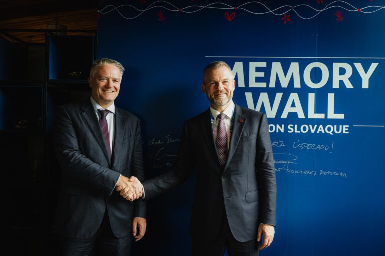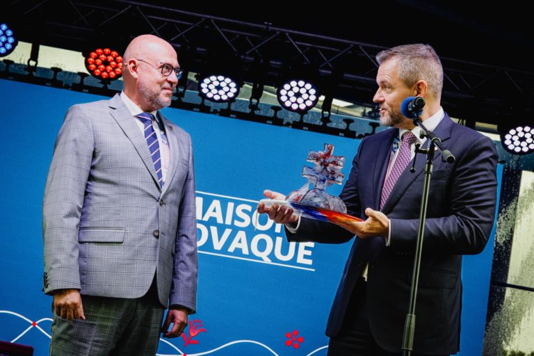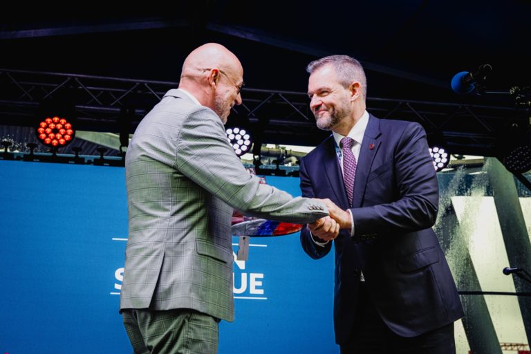 Zľava: Prezident SOŠV Anton Siekel a prezident SR Peter Pellegrini počas otvorenia Slovenského olympijského domu Maison Slovaque v Paríži. Bratislava, 27. júl 2024. Foto: SITA/Kancelária prezidenta SR