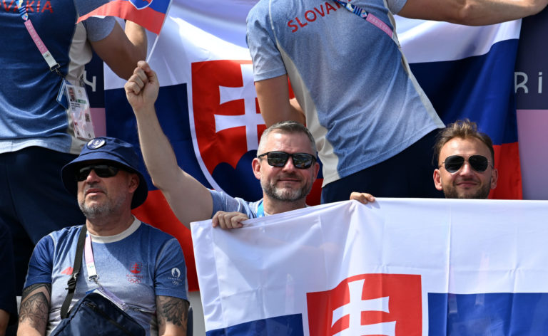 Zľava: Prezident SOŠV Anton Siekel, prezident SR Peter Pellegrini a minister vnútra Matúš Šutaj Eštok počas semifinálovej jazdy kajakárok vo vodnom slalome v rámci XXXIII. letných olympijských hier 2024 v Paríži. Paríž, 28. júl 2024. Foto: SITA/Martin Medňanský