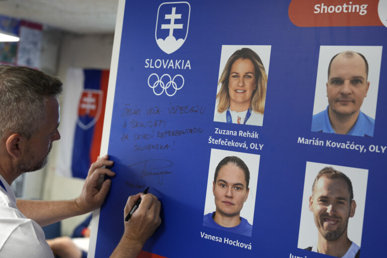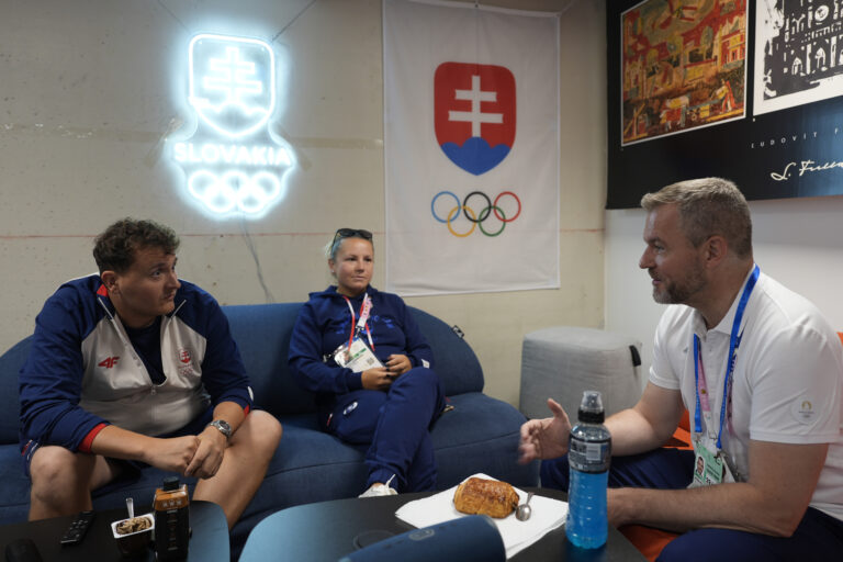 Slovenský prezident Peter Pellegrini pri stretnutí s lukostrelkyňou Denisou Baránkovou na letnej olympiáde v Paríži. Paríž, 29. júl 2024. Foto: SITA/AP