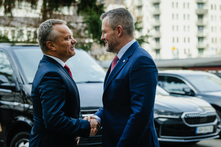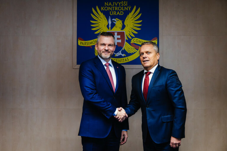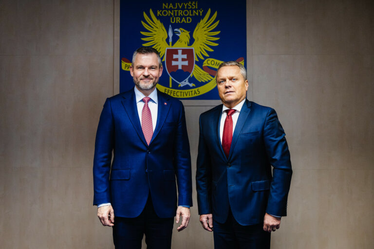 Zľava: Prezident SR Peter Pellegrini a predseda NKÚ SR Ľubomír Andrassy počas stretnutia v rámci návštevy Najvyššieho kontrolného úradu SR prezidentom SR. Bratislava, 11. marec 2025. Foto: SITA/Kancelária prezidenta SR