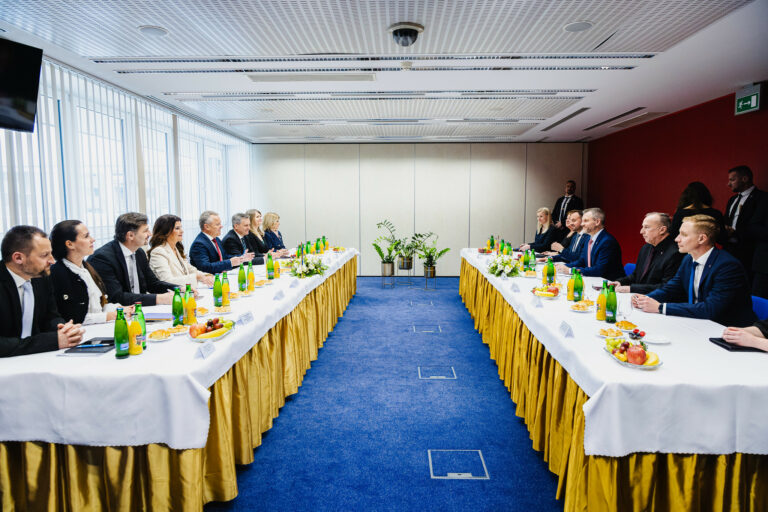 Prezident SR Peter Pellegrini (tretí sprava) a predseda NKÚ SR Ľubomír Andrassy (piaty zľava) počas rokovania v rámci návštevy Najvyššieho kontrolného úradu SR prezidentom SR. Bratislava, 11. marec 2025. Foto: SITA/Kancelária prezidenta SR