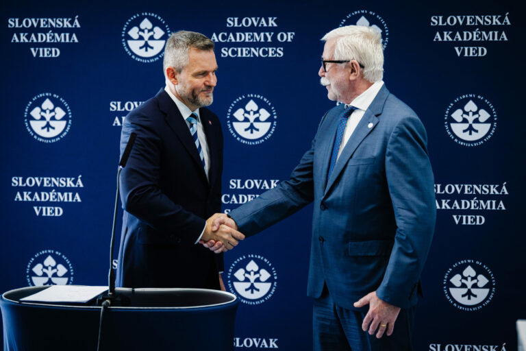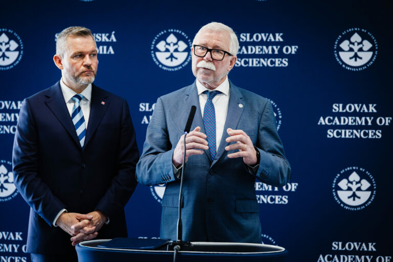Zľava: Prezident SR Peter Pellegrini a predseda SAV Pavol Šajgalík počas tlačovej konferencie v rámci návštevy prezidenta SR v Slovenskej akadémie vied (SAV) v Bratislave. Bratislava, 12. marec 2025. Foto: SITA/Kancelária prezidenta SR