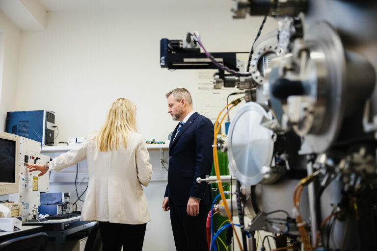 Prezident SR Peter Pellegrini (vpravo) počas prehliadky laboratórií SAV v rámci návštevy v Slovenskej akadémii vied (SAV) v Bratislave. Bratislava, 12. marec 2025. Foto: SITA/Kancelária prezidenta SR