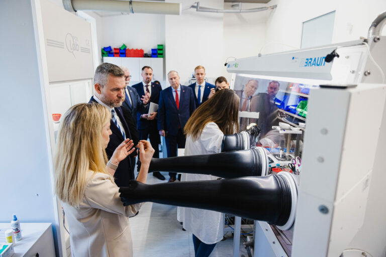 Prezident SR Peter Pellegrini (vľavo) počas prehliadky laboratórií SAV v rámci návštevy v Slovenskej akadémii vied (SAV) v Bratislave. Bratislava, 12. marec 2025. Foto: SITA/Kancelária prezidenta SR