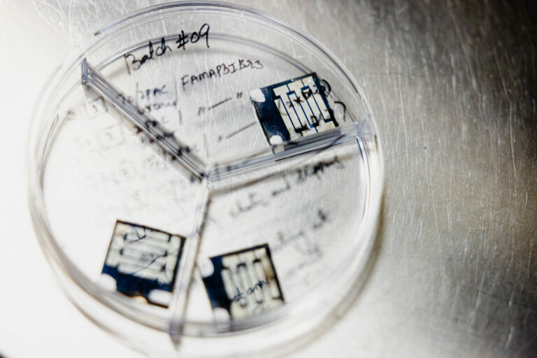 Výskumné vzorky solárnych článkov v miske počas prehliadky laboratórií SAV v rámci návštevy prezidenta SR v Slovenskej akadémii vied (SAV) v Bratislave. Bratislava, 12. marec 2025. Foto: SITA/Kancelária prezidenta SR