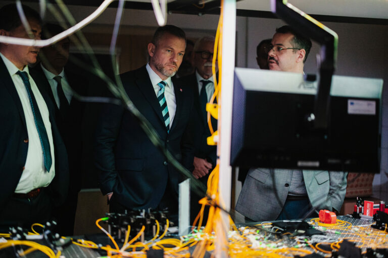 Prezident SR Peter Pellegrini (druhý zľava) počas prehliadky laboratórií SAV v rámci návštevy v Slovenskej akadémii vied (SAV) v Bratislave. Bratislava, 12. marec 2025. Foto: SITA/Kancelária prezidenta SR