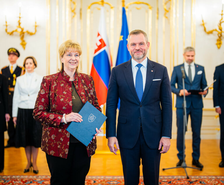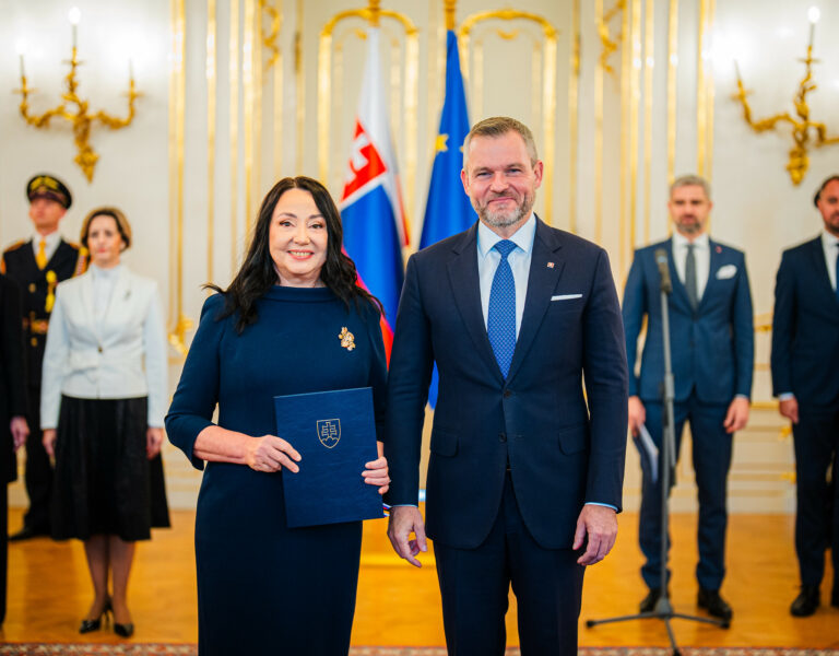 V popredí sprava: Prezident SR Peter Pellegrini a nová veľvyslankyňa v Čiernej Hore Eva Ponomarenková počas odovzdávania poverovacích listín šiestim novým mimoriadnym a splnomocneným veľvyslancom SR prezidentom SR v Prezidentskom paláci. Bratislava, 9. október 2025. Foto: SITA/Kancelária prezidenta SR