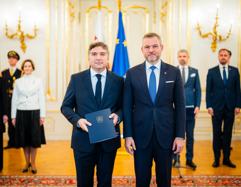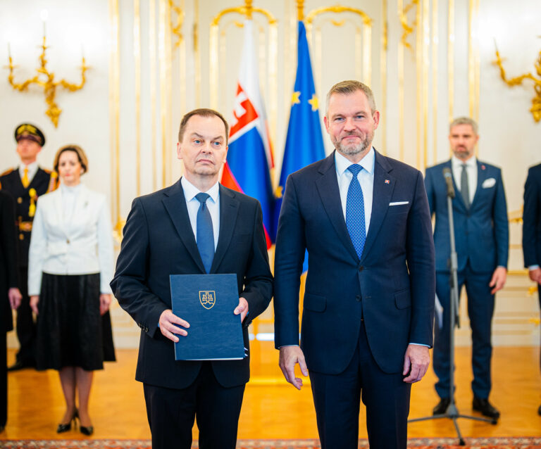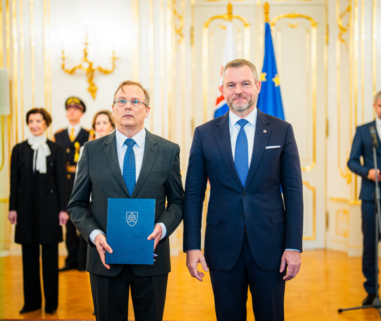 V popredí sprava: Prezident SR Peter Pellegrini a nový veľvyslanec v Nigérijskej federatívnej republike Martin Podstavek počas odovzdávania poverovacích listín šiestim novým mimoriadnym a splnomocneným veľvyslancom SR prezidentom SR v Prezidentskom paláci. Bratislava, 9. október 2025. Foto: SITA/Kancelária prezidenta SR