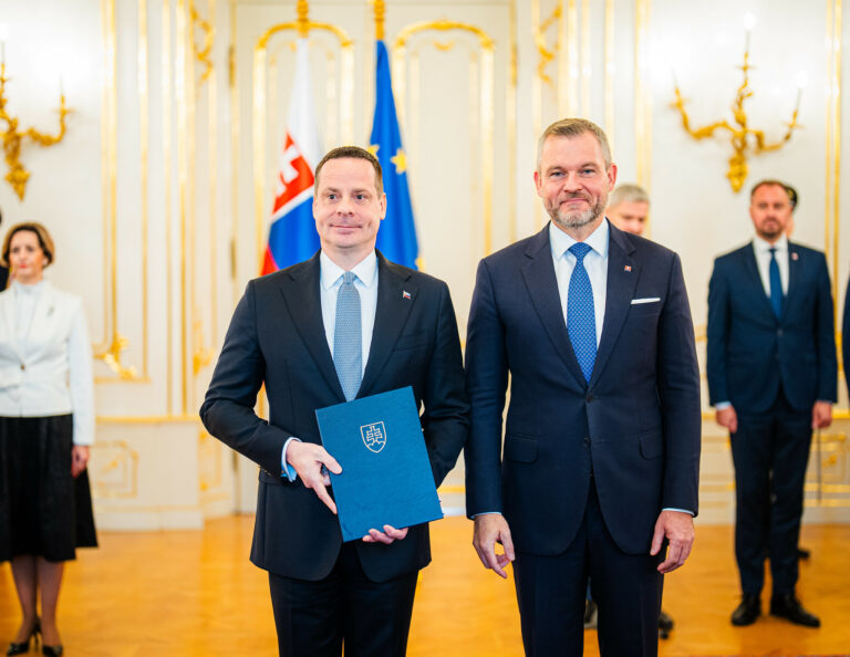 V popredí sprava: Prezident SR Peter Pellegrini a nový veľvyslanec v Spojených štátoch amerických Andrej Droba počas odovzdávania poverovacích listín šiestim novým mimoriadnym a splnomocneným veľvyslancom SR prezidentom SR v Prezidentskom paláci. Bratislava, 9. október 2025. Foto: SITA/Kancelária prezidenta SR