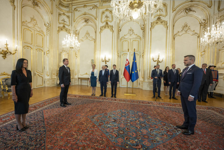 Prezident SR Peter Pellegrini (vpravo) počas odovzdávania poverovacích listín v Prezidentskom paláci veľvyslancom Slovenskej republiky v zahraničí. Bratislava, 3. júl 2024. Foto: SITA/Milan Illík