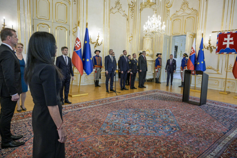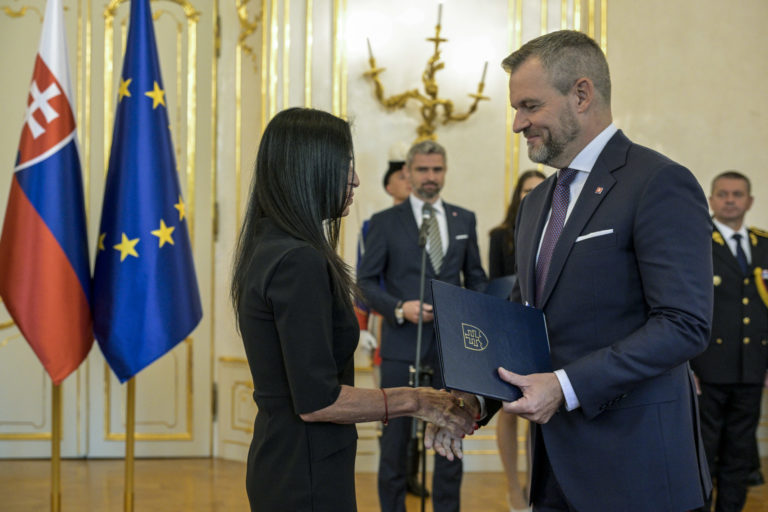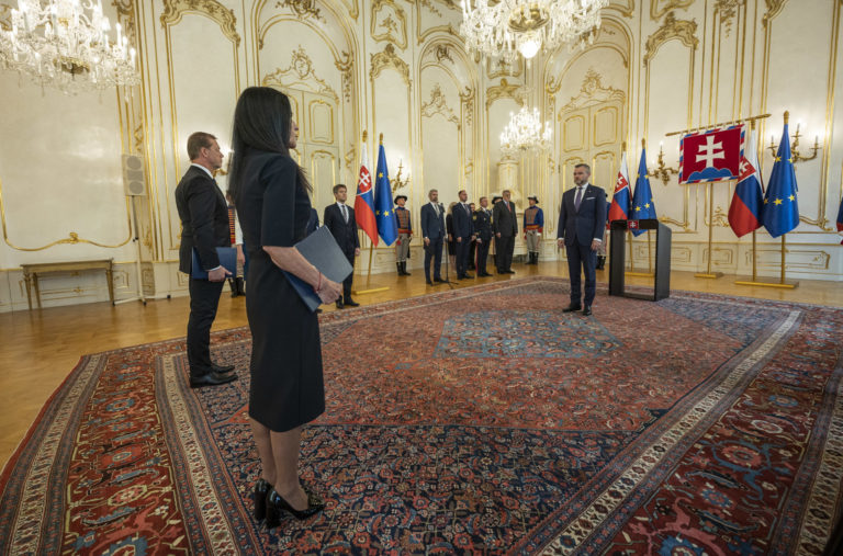 Zľava v popredí: Dezignovaná veľvyslankyňa pre Izraelský štát Barbara Mešťanová a prezident SR Peter Pellegrini počas odovzdávania poverovacích listín prezidentom SR v Prezidentskom paláci veľvyslancom Slovenskej republiky v zahraničí. Bratislava, 3. júl 2024. Foto: SITA/Milan Illík