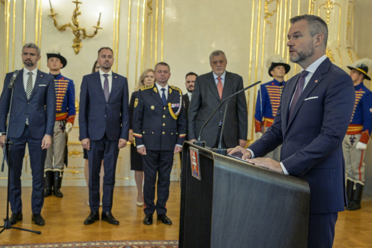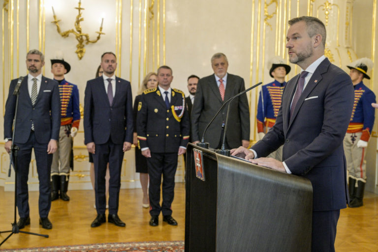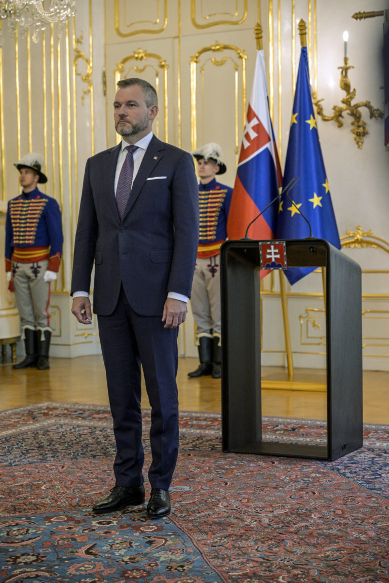 Prezident SR Peter Pellegrini počas odovzdávania poverovacích listín v Prezidentskom paláci veľvyslancom Slovenskej republiky v zahraničí. Bratislava, 3. júl 2024. Foto: SITA/Milan Illík