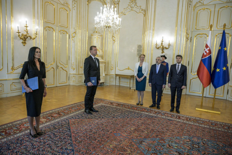 Vedúci stálej delegácie SR pri Severoatlantickej aliancii (NATO) Marek Varga (druhý zľava), dezignovaná veľvyslankyňa pre Izraelský štát Barbara Mešťanová (vľavo) a prezident SR Peter Pellegrini (vpravo) počas odovzdávania poverovacích listín prezidentom SR v Prezidentskom paláci veľvyslancom Slovenskej republiky v zahraničí. Bratislava, 3. júl 2024. Foto: SITA/Milan Illík