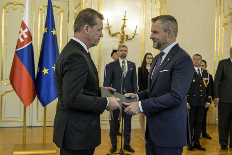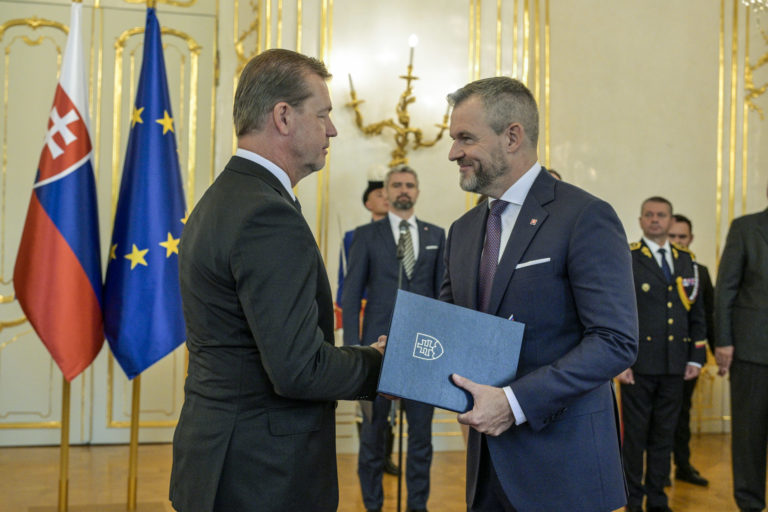 Sprava: Prezident SR Peter Pellegrini a vedúci stálej delegácie SR pri Severoatlantickej aliancii (NATO) Marek Varga počas odovzdávania poverovacích listín prezidentom SR v Prezidentskom paláci veľvyslancom Slovenskej republiky v zahraničí. Bratislava, 3. júl 2024. Foto: SITA/Milan Illík