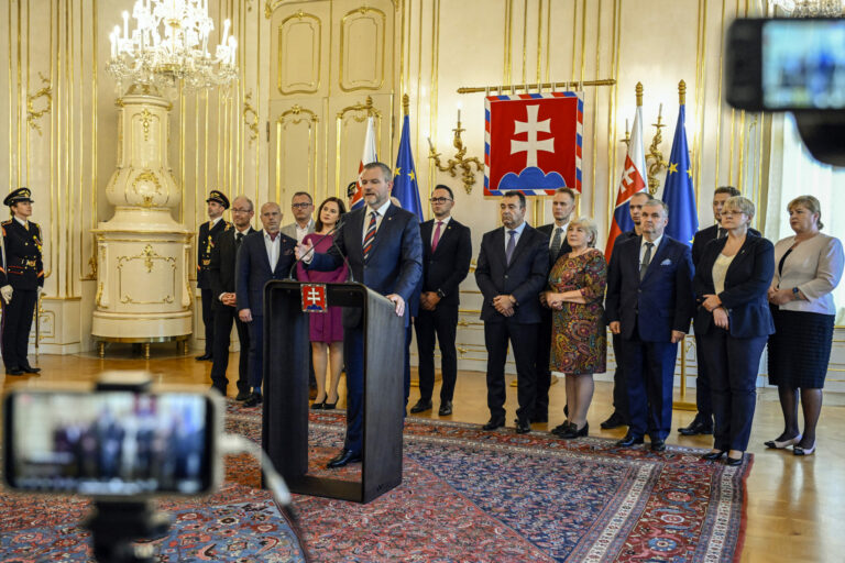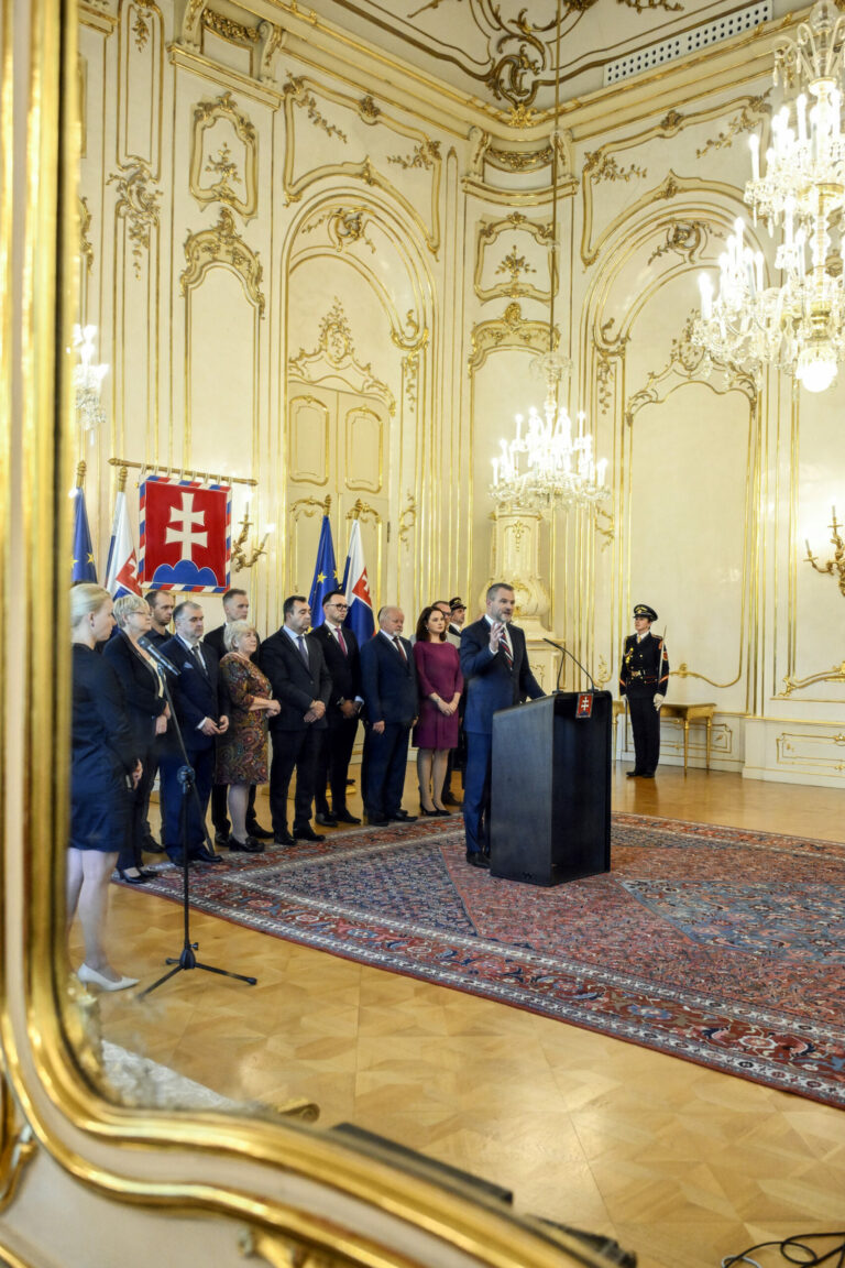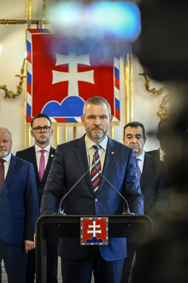 Prezident SR Peter Pellegrini (v popredí) počas vyhlásenia prezidenta SR po stretnutí s predstaviteľmi zdravotníctva v Prezidentskom paláci. Bratislava, 8. október 2024. Foto: archívne, SITA/Milan Illík