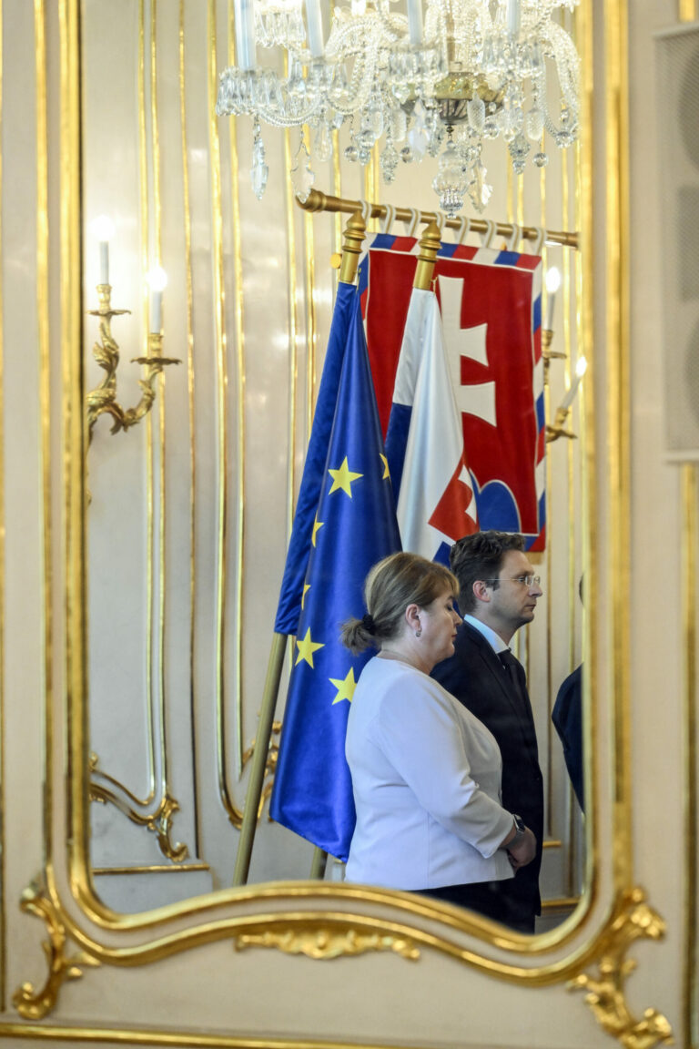 Sprava: Predsedníčka OZ SaPA Monika Kavecká a predseda Lekárskeho odborového združenia Peter Visolajský počas vyhlásenia prezidenta SR po stretnutí s predstaviteľmi zdravotníctva v Prezidentskom paláci. Bratislava, 8. október 2024. Foto: SITA/Milan Illík